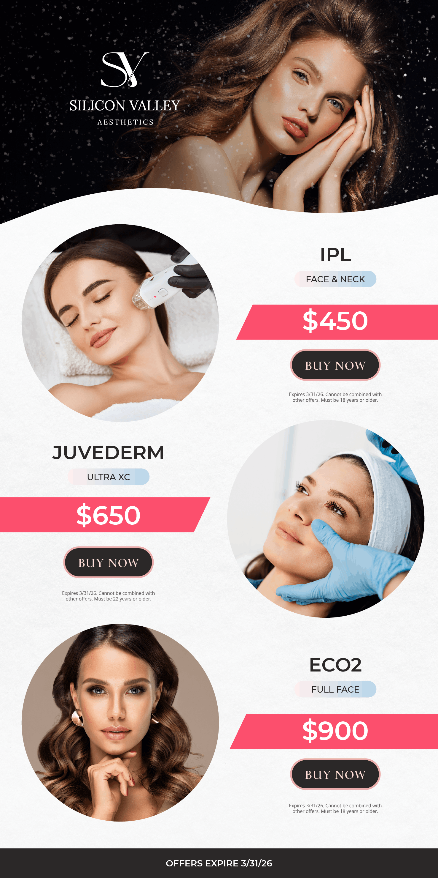 We appreciate all referrals, so if you refer a friend to us who gets a treatment, you may be eligible for a discount on your next treatment at Silicon Valley Aesthetics. Your friend must mention your name as the referral source when completing their intake paperwork. Some restrictions apply, call for details.
